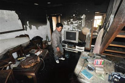 在2号楼前往上看,发现着火居民家卧室窗户黑乎乎一片,塑钢门窗被烧得精光。“火当时烧得很大。”居民郭先生介绍说,着火时屋里有一名老太太和两个小孩,着火后老太太赶紧领着孩子冲到楼下,脸吓得惨白,两个小孩也吓得不轻。