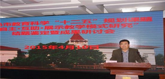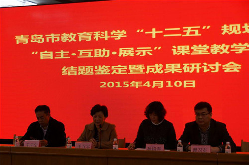 2015年4月10日上午,青岛三中多功能厅可谓是济济一堂、盛况空前,青岛市教育科学“十二五”规划课题——“自主 互助 展示教学模式研究”结题鉴定暨成果研讨会在此隆重召开,出席本次会议的专家领导有青岛市教育科学研究所所长于立平;青岛市普教研室副主任于元宝;中国海洋大学副教授、博士孙艳霞;青岛三中校长翟召东等。与会人员还有各区市教科所所长、局属学校分管校长、市级“十二五”立项课题有关项目组课题主持人、部分初中校长及本校教师共计160余人。