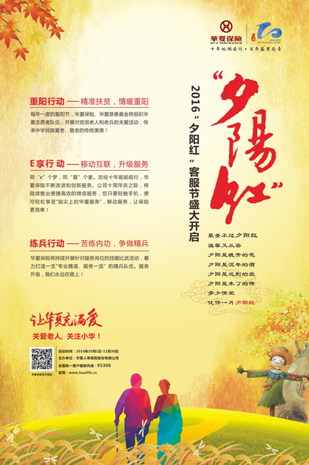 老吾老以及人之老,幼吾幼以及人之幼。“爱老慈幼”不仅是中华民族传统文化的精粹,更是华夏保险矢志不渝的责任。本届客服节,华夏保险将以“爱老助贫”为公益重点,在重阳节期间组织华夏志愿者队伍开展对贫困老人和老兵的关爱活动,传承中华民族爱老、敬老的传统美德!
