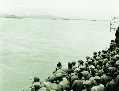 1949年,美国海军陆战队离开青岛,队员们挤在栏杆边回望青岛