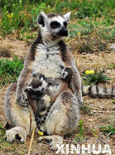 5月7日,山东青岛野生动物世界的母环尾狐猴在为小环尾狐猴哺乳。(俞方平 摄)