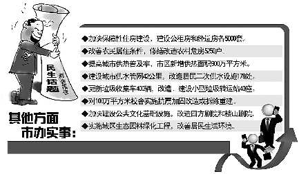 记者从会上获悉,截至去年12月底,市政府去年公布的办9件16项实事全部完成年度目标任务。年内开工建设廉租住房3000套和经济适用房5000套,综合整治三片旧小区35万平方米,修缮改造农村危房8125户,市区新增供热面积1005万平方米,更换城市供水管网68公里,建设排水管网160.4公里,完成二次供水设施改造206处,打通长春路等10条未贯通道路,更新达到国Ⅲ排放标准公交车1208辆,为169所中小学校周边安装了交通安全智能管理系统,实施了城乡居民社会基本养老保险制度试点、9项基本公共卫生项目和6项重大公共卫生项目,提高了新型农村合作医疗筹资标准、市区城镇居民医保补助标准和城镇职工基本医疗保险最高支付限额。