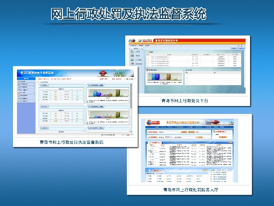 青岛在开展行政处罚权规范透明运行工作中,全面借助信息化手段,依托市电子政务共享平台,建设了由“网上行政处罚平台”、“网上行政处罚执法监督系统”和“网上行政处罚服务大厅”三大子系统组成的全市统一的网上行政执法平台。我市行政执法系统的建成运行,为规范执法行为,优化工作流程,强化行政监督,深化信息公开提供了强有力的保障,也是市政府利用信息网络技术,通过技术创新推动行政模式创新的重大举措。