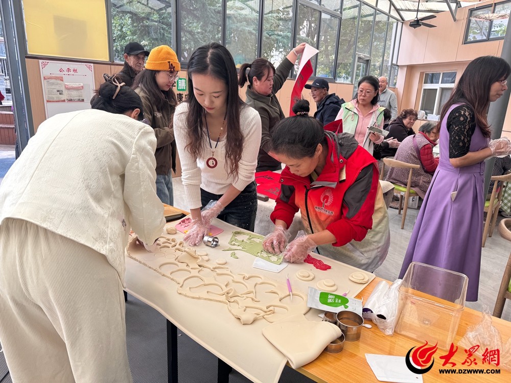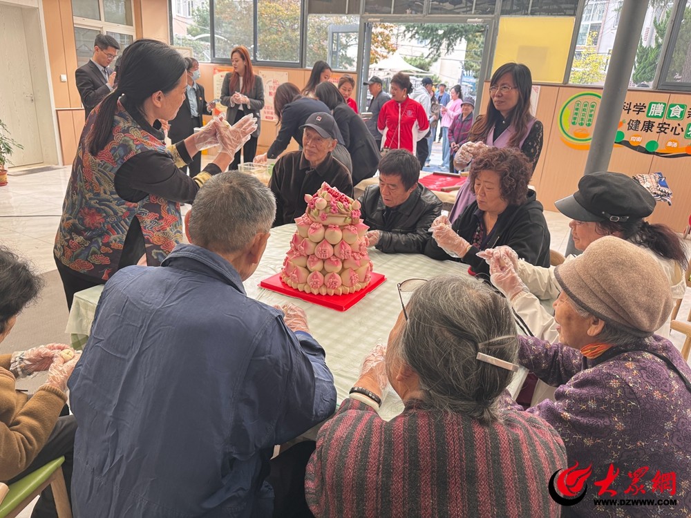 伊春路社区文艺队的叔叔阿姨们带了精彩的演出,女声独唱《父亲》、合唱《歌唱祖国》,既是对祖国的祝福,也是老一辈人对生活的热爱。活动特别邀请了书法家朱文松先生现场挥毫。他为农历九月份生日的三位老人精心创作了书法“寿”字,并将这份承载着健康与长寿祝愿的墨宝亲手赠予老人,将现场尊老敬老的温暖氛围推向高潮。胶东花饽饽是山东省非物质文化遗产,刘金芳老师作为非遗手艺传承人,与现场的老人们一起互动,让每个老人都做出了好看的寿桃。老人们围桌而坐,一边频频举筷,品尝美味佳肴,一边开心聊天,畅谈生活点滴,个个笑颜常开,年轻人用行动给予老人温暖与陪伴,让老人度过一个温馨愉快的节日。