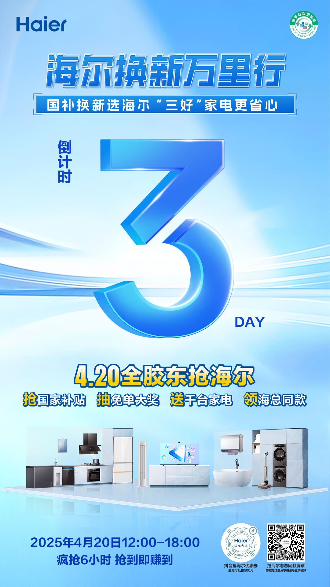 国补换新倒计时,三好家电将启程 胶东抢机看海尔,绿色消费正当时 政企双补省真金,4999免单等你赢 预存30抵200,科技赋能焕新家 倒计时3天,准备好冲刺吧![详细]