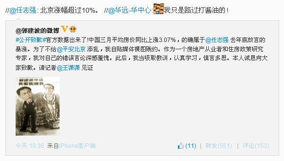 #公开致歉#官方数据出来了!中国三月平均房价同比上涨3.07%,的确属于@任志强去年底放言的暴涨。为了不给@平安北京添乱,我自贴媒体裸图贱约。作为一个房地产从业者和住房政策研究专家,我对自己的错误言论深感羞愧。此后,我当吸取教训,认真学习,慎言多思。本人诚恳向大家致歉。请记者@王潇潇见证
