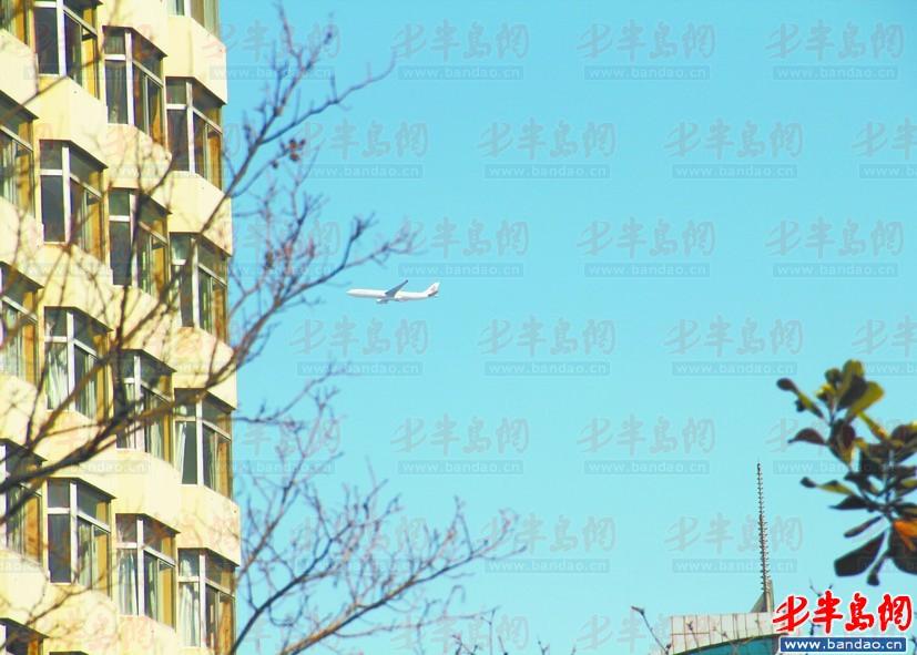 在香港中路附近,可以清楚地看见一架飞机飞过蓝天。