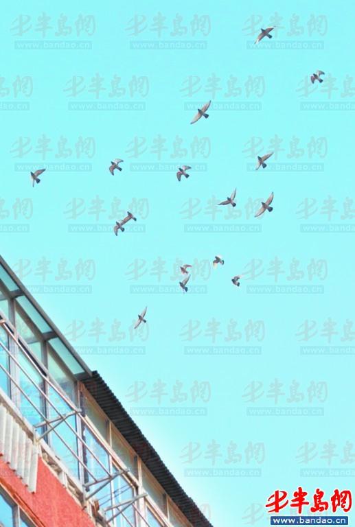 台东三路附近,十几只鸽子看见难得一见的蓝天仿佛异常兴奋,不停地在空中盘旋飞翔。