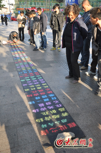10月8日,崔显仁从烟台坐车到了青岛,这是他第三次来青岛。多年来,在气候适宜的岛城,他走遍了每条商业街,结识了不少朋友。除此之外,他对青岛还有一份特殊的感情,因为一位好心人的热 心令他感动万分、终身难忘。崔显仁告诉记者,在青岛他一般会选择台东、科技街和李村公园这样人多繁华的地方,不少好心人会看到他身材志坚、流畅飘逸的粉笔书法便给予一定的帮助,他对每位好 心人都会真诚的说一句“谢谢”。