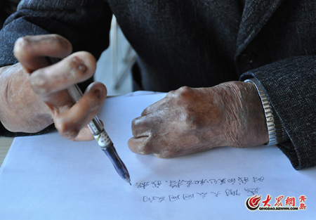大众网青岛10月17日讯(记者 孙雯丽 曹亮)一张被烧毁的脸,甚至吃饭、说话都有点困难,一双被烧的蜷缩、变形的双手,拿东西都有点吃力。然而崔显仁就是用这双残缺的双手在全国10多个城市的街头写下了彩色的字迹;他也用这五颜六色的醒世之言、古香飘逸的字体、锲而不舍的精神感染了各地的市民与网友,他也因此被方正字库看中。近日,备受关注的“粉笔哥” 崔显仁在青岛接受了大众网记者的专访,诉说他的坎坷人生,畅谈未来美好希望,他通过大众网向全国各地网友说:“感谢网友们对我的关心和支持,我将继续努力工作,不辜负你们对我的希望”。