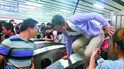 据杭州媒体报道,昨天,网友“@小怪兽的心声”发在微博的一张照片在网上疯传:杭州地铁站闸机口人满为患,一名女子正从闸机上翻过。照片上,一眼望去,整个地铁站密密麻麻挤满了人,等待的队伍从闸机口一直排到楼梯。