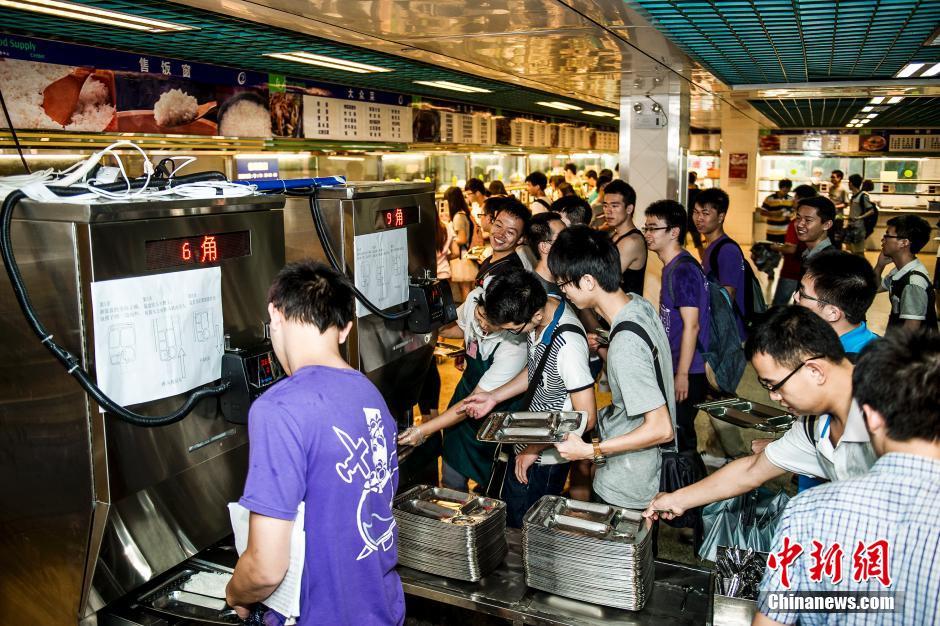 6月11日,广州华南理工大学一食堂内,学生们正在使用新安装的自动打饭机打饭。近日,华工饭堂新购置的两台自动打饭机投入使用。学生只需按照指示放入托盘并刷卡,机器即可自动按量出饭。中新社发 龙宇阳 摄