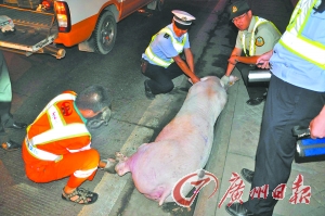 韶关交警一大队三中队中队长郭福兴告诉记者,当天晚上7时40分许,他和民警处理完交通事故返回途中,在北行靠椅山隧道内远远看见一辆小面的停在慢车道,有两人在抬着一个体积庞大、十分沉重的物体。为防止追尾事故发生,警车立即拉响警报驶向前去。谁知小面的一听到警报声,立即开车跑了。正当民警疑惑时,突然发现路边趴着一头大肥猪。