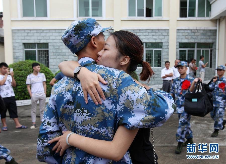 9月5日,在广西柳城县人民武装部,一名入伍新兵临行前与亲人深情相拥。自当日起,全国各地新兵陆续启程奔赴军营,开始他们的军旅生涯。 摄影:邓克轶/新华社