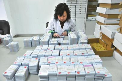身份证做出来后的最后一步是校验,而这道最后的、也是最重要的关卡由两位大姐把守——40多岁的闫大姐和熊大姐。一个50多方米的房间,桌子上堆着将近1米高的纸盒和几十摞捆绑成形的身份证。两位大姐正埋头扎在桌上,用手迅速地捋着身份证,短短10秒钟就数完了80张,娴熟的动作如同银行工作人员点钞一般。