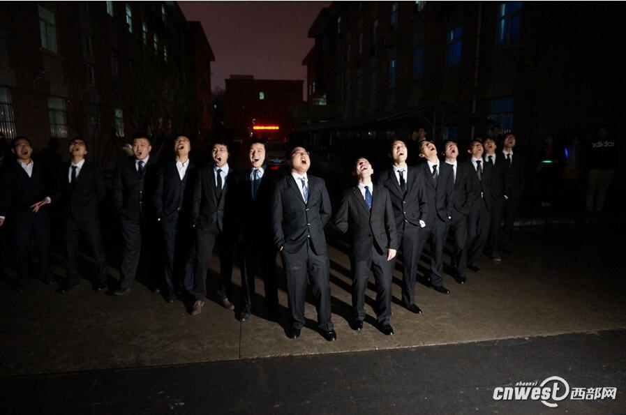 3月25日晚10点多,西北工业大学航天学院女生宿舍楼下,一群男生西装革履,口号整齐,朝着楼上大声喊叫,引来不少男生女生围观。据了解,这是西工大航天学院2012级硕士研究生杨乐的同学,为他精心策划的一场求婚。
