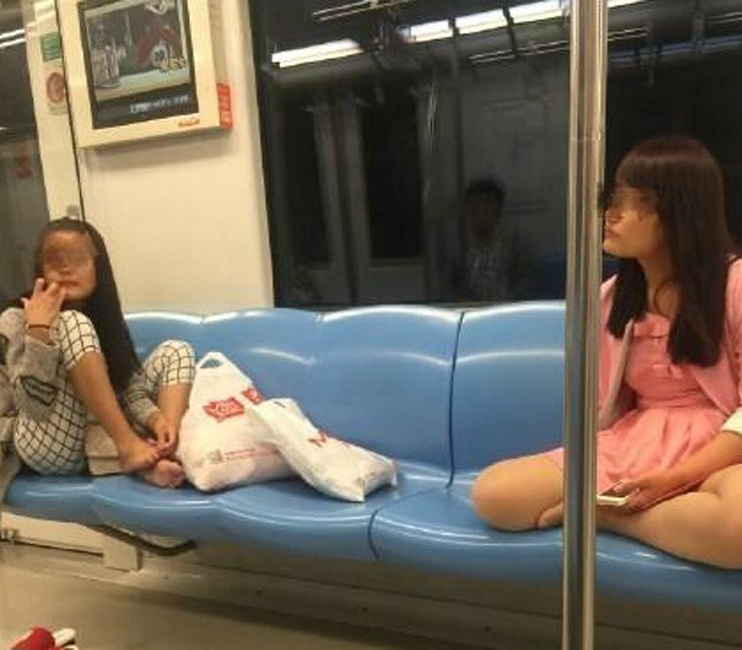 5月12日报道,11日晚,江苏南京,有市民在地铁车厢内拍到两位姑娘盘坐在座位上,并且占了一整排的位子。目击者还称姑娘把刚抠过脚的手放进了嘴里,令人瞠目结舌。网友纷纷呼吁要对此举进行处罚。