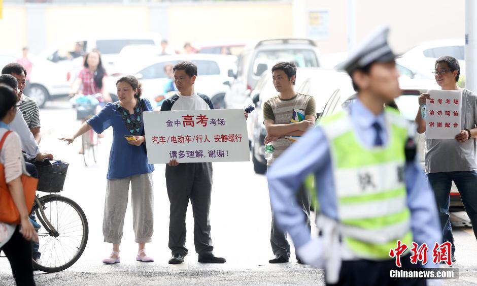 6月8日下午3点,2015高考英语听力考试,紧挨着南京金陵中学高考考点的中山路上,虽然当地警方已经将道路封闭,禁止机动车同行,但部分心急的考生家长仍然自发举着牌子指挥过往的自行车、电动车绕道而行,以免噪音影响考生的考试。中新社发 泱波 摄